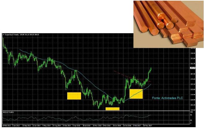 Nell'ultimo mese le quotazioni del Copper, (Contratto CFD ActivTrades, CopperSep17, Daily) sono passate da un minimo a $270 ad un massimo a $300. Il trend sul Rame, sembra impostato verso un rialzo molto interessante, grazie ad una formazione di testa e spalle visibile in time frame settimanale. Se nel breve periodo è possibile una fase di storno, complice la fase di ipercomprato e la vicinanza dei prezzi in una zona di resistenza intermedia, nel medio periodo invece è piuttosto probabile che le quotazioni continuino nella loro fase di crescita portando così a compimento il pattern tecnico di testa e spalle, con target dapprima a $315 e poi verso $340.