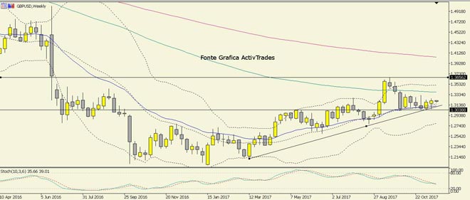 Nel frattempo, poche le altre novità sul fronte valutario, con le restanti coppie sui prezzi di venerdì sera. Scendono solo tutti i cross dell’Euro, mentre la sterlina rimane stabile in area 1.3200, così come Aud e Nzd sembrano correggere dai ribassi della scorsa settimana. UsdJpy appena sopra 112.00, mentre l’equity tende ad essere distributivo, almeno per la parte concernente gli indici. Niente di che ma la presenza di massimi inferiori e pure minimi inferiori, parrebbe creare la condizioni per un aumento generale dell’avversione al rischio che peraltro si percepisce anche sull’oro, ripresosi quota 1290 dai livelli di 1260 della settimana scorsa. Da un punto di vista tecnico, sembra importante la tenuta della sterlina sopra certi livelli e sui grafici di medio lungo termine, la tenuta di tutta l’area sopra 1.3000 30 sembrerebbe dare lo slancio alla valuta britannica, per tornare sopra verso 1.3350 e 1.3550 1.3600 nel medio termine, anche se solo una violazione di quel livello, aprirebbe la strada a target ben superiori, che nel medio periodo, dovrebbero essere intorno all’area di 1.4700.