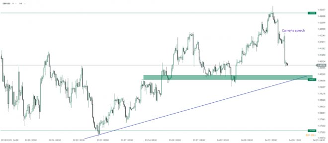 La sterlina della Gran Bretagna si è improvvisamente ribassata dopo che il governatore della Banca d'Inghilterra, Mark Carney, ha alluso al fatto che ci sono “altri incontri” durante quest'anno in cui la Banca potrebbe alzare i tassi. Ha agitato la valuta inviando un messaggio esplicito agli investitori “non date per scontato un rialzo dei tassi di maggio”. Invece di un chiaro suggerimento per un rialzo dei tassi il mese prossimo, Carney ha offerto agli investitori indizi abbastanza fangosi e che l'economia probabilmente avrà bisogno di alcuni aumenti dei tassi nei prossimi anni. Allo stesso tempo, non ha omesso gli ultimi dati macroeconomici riconoscendo la sua debolezza (mercato del lavoro, inflazione e vendite al dettaglio). Comprensibilmente, la probabilità implicita OIS di un aumento a maggio è scivolata notevolmente al di sotto del 50% da oltre l'80% in cui si trovava prima del discorso.