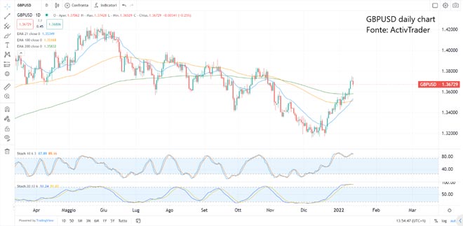Sul petrolio assistiamo ancora ad accelerazioni rialziste con obiettivi sul doppio massimo a 85.30 e, nel caso di rottura, non è da escludere l’area di 90 dollari al barile. Oro a ridosso della resistenza chiave a 1.830 che, se violata, aprirebbe la strada al ritorno dei massimi visti a metà novembre a 1.875 dollari l’oncia. Il Dollar index, dopo i test di 96.70, è tornato a ridosso dei supporti chiave posti tra 94.00 e 94.30, che non deve rompere se vuole proseguire la sua corsa rialzista di medio termine.