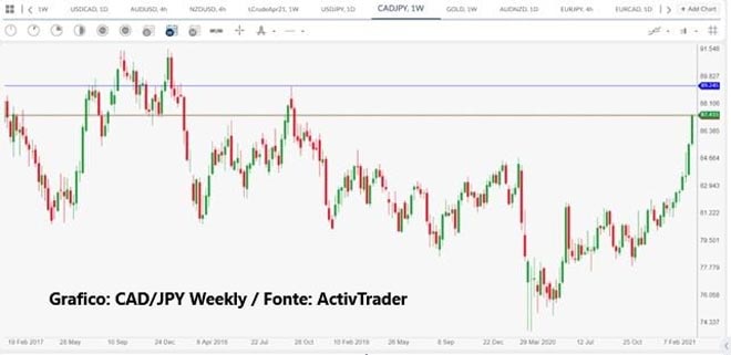 Da un lato lo Jpy, spinto al ribasso dai flussi derivanti dalla chiusura di posizioni long che da tempo erano presenti sul mercato e che si sono girate short, oltre che per la pressione che la Boj aveva messo sui compratori di Jpy quando il cambio era intorno ai 104 Jpy per dollaro. Dall’altro lato il dollaro canadese, sul quale invece sono entrati importanti flussi in acquisto, specie venerdì scorso, quando i dati canadesi sull’occupazione hanno sorpreso gli analisti, con un 8.2% rispetto ad un consensus al 9.2% e un deciso miglioramento degli occupati nel mese di febbraio, a 259 mila unità contro attese di 75 mila. UsdCad che è sceso in pochi minuti da 1.2570 a 1.2470 e a farne le spese è stato proprio il cross CadJpy su cui è interessante soffermarsi un attimo per analizzarlo da vicino. Dal mese di novembre scorso il cross è salito di circa il 12.5% da 77.50 a 87.50, ovvero 10 figure, e sembra ora indirizzato ai massimi dell’ottobre 2018 quando aveva raggiunto quota 89.20-30 area. Stiamo arrivando su eccessi significativi, ma non possiamo escludere il test del doppio massimo, che potrebbe anche giungere in poco tempo. Vedremo se la ragione sarà una ulteriore rialzo del UsdJpy oppure una discesa di UsdCad o ancora di entrambe.