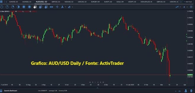 L’avevamo richiamato ieri il fatto che la leva bassa sarebbe stata l’unico deterrente per chi avesse voluto restare nel mercato, in caso di armageddon. E quella di ieri è stata una giornata che molti ricorderanno, con crolli che hanno ricordato distintamente quanto avvenne nel periodo 2007 2009, quando nel pieno della crisi Lehman, sulle valute si vedevano spread allargarsi a dismisura e movimenti percentuali intono al 10-15% al giorno. Nelle ultime sedute, ovvero questa settimana, quello che ha destato più impressione è stato AudUsd con un movimento unilaterale, senza soluzione di continuità di quasi 500 pips, che rappresentano un movimento percentuale di quasi l’8% e stiamo parlando della valuta di un paese del primo mondo, peraltro intaccata relativamente dall’epidemia, ma considerata dalla collettività finanziaria come una valuta da investimento da colpire in caso di risk off, in una analisi che non tiene conto dei dati macro di ogni paese. Ma lo sappiamo, durante le fasi di panic selling è così, bisogna osservare coppia di valute per coppia di valute, e chiedersi quale sia tra le due quella che viene acquistata in tempi di crollo dei mercati azionari e quella invece che viene sacrificata sull’altare della paura.