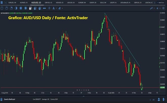 I movimenti di venerdì sera, caratterizzati da un ribasso del dollaro, sono stati generati dalla pubblicazione degli indicatori dei direttori di acquisto, con il Pmi dei servizi Usa, uscito addirittura a 49.4, sotto la soglia fatidica di 50, mentre il composite è uscito a 49.6 rispetto ad un consensus di 53. Un primo segnale che il rallentamento globale potrebbe colpire anche l’economia Usa. Ovviamente c’era stata una reazione delle oceaniche, dell’euro e della sterlina, ma ieri sera in apertura, gran parte dei guadagni di queste valute contro Usd era stato rimangiato dal timore di questo aumento dei contagi in Italia e da una paura generalizzata che questa situazione possa allargarsi all’Europa e al resto del mondo. AudUsd è al minimo degli ultimi 11 anni, e il precedente minimo significativo lo troviamo al culmine della crisi del 2008, quando i prezzi toccarono quota 0.5980, al culmine della crisi Lehman. Da quel livello poi Aud cominciò la grande salita culminata con un massimo visto poi nel Novembre 2011 a 1.1060.