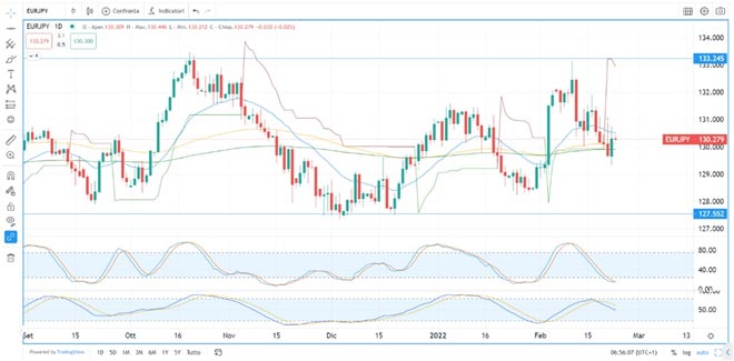 Molto più semplice, in fondo, risulta analizzare l’andamento dei mercati che, nonostante tutto reggono l’urto. Partendo dai listini azionari, segnaliamo ovviamente la discesa degli indici Usa con il Dow Jones, S&P e Nasdaq che mollano qualcosa ma non troppo. Tecnicamente il Dow deve ancora raggiungere il minimo precedente a 33.150 realizzato il 24 gennaio, mentre il Nasdaq lo ha già violato al ribasso correggendo però e ritornando sopra a tale minimo. L’S&P 500 invece deve ancora testare il minimo registrato a fine mese scorso a 4.219 punti. Il che evidenzia come, anche in presenza di una tensione ormai alle stelle, i mercati abbiano comunque una maggiore fiducia in una soluzione diplomatica, rispetto agli addetti ai lavori sul campo.