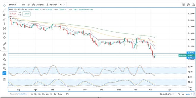Sui cambi, l’emorragia dell’Euro, per ora si è fermata, anche in ragione di una notizia che, nella tarda mattinata di ieri, ha spinto la moneta unica leggermente al rialzo. La notizia in questione è quella per cui la UE avrebbe deciso di emettere delle obbligazioni per finanziare il comparto energetico e quello militare. Una decisione che evidenzia, per la prima volta, un cambiamento nel senso di maggiore unità, che poi era quello che negli anni intorno al 2010, rappresentava un mantra per il nostro paese, ovvero qualcosa di simile agli Eurobond, che significava in sostanza mutualizzare i debiti di ogni paese del vecchio continente. Un primo passo che ha ridato un minimo di vigore alla moneta unica, risalita al di sopra di 1.0900 contro dollaro e 0.8300 contro sterlina. Ma nel tardo pomeriggio, è uscita poi anche una notizia, ripresa da un intervista al leader Ucraino Zelensky, che si diceva disposto ad accettare qualche compromesso in sede negoziale, relativo al Donbass e alla Crimea, così come all’eventualità di non chiedere l’adesione alla Nato. Una news che ha spinto l’EurUsd fino a 1.0959 anche se poi i prezzi hanno corretto tornando a 1.0900. La ragione è legata al fatto che prima di avere qualche speranza di cessate il fuoco definitivo, bisognerà attendere la risposta di Putin, che, siamo certi, arriverà presto.