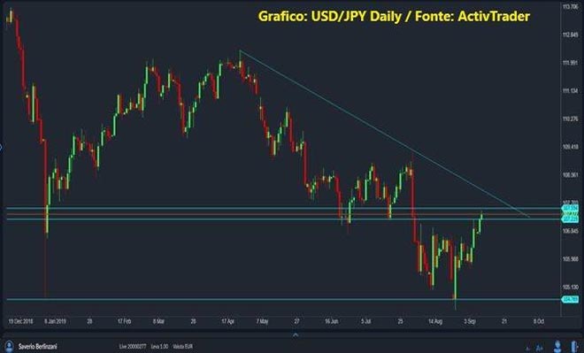 Venendo all’analisi tecnica, segnaliamo la forza della sterlina, che fino a quando rimane al di sopra di 1.2190-00, potrebbe andare ad attaccare 1.2500 e, perché no, anche 1.2650 nel caso venissero confermate le elezioni oppure se Boris Johnson trovasse un accordo con la Ue. Ieri il Primo Ministro si è rivelato più cauto del solito dichiarando che un mancato accordo con la Ue sarebbe un insuccesso e un fallimento, nel tentativo di tendere la mano alla Ue stessa in favore di un agreement che sicuramente allenterebbe ulteriormente la tensione sulla valuta britannica. Da segnalare anche il tentativo di trovare un accordo con l’Irlanda per allentare, ma non completamente eliminare, i confini, come invece inizialmente era stato annunciato. Segnaliamo inoltre la risalita del UsdJpy alimentata da un risk on generalizzato, con i livelli di 107.50-60 a fare da baluardo. Nel caso di violazione attenzione al ritorno in area 109.00, molto probabile.