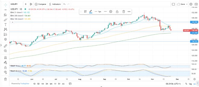 Il dollaro ha ceduto terreno contro le principali valute, scendendo ancora, con un movimento che se lo valutassimo nei soli mesi di ottobre e novembre sarebbe molto simile a quanto abbiamo visto dopo la pandemia, quando la grande salita della divisa Usa fu ribaltata senza grandi correzioni e in relativamente breve tempo. L’EurUsd da 0.9532 del 28 settembre è salito quasi il 9% arrivando ad un massimo di 1.0480 il 15 Novembre, mentre la Sterlina ha fatto ancora meglio, circa il 15% da quel famoso lunedì 26 settembre quando scese in flash crash a toccare 1.0320. Insomma, movimenti importanti che dimostrano come le accelerazioni ribassiste abbiano rappresentato il momento finale di un movimento di lungo periodo ormai arrivato al capolinea.