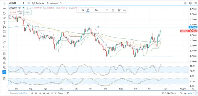 I mercati però, lo abbiamo detto e ripetuto, stanno comportandosi in modo estremamente prudente, con oscillazioni che continuano tutto sommato a rimanere contenute e stabili, sull’azionario, ma anche su obbligazionario e materie prime. Oro stabile in area 1930 1940 mentre il petrolio rimane tra 110.00 e 115.00 dollari, almeno per ora. Sulle valute segnaliamo un Euro che scivola ma in modo contenuto, per ora, compreso tra 1.0960 e 1.1040 con il Cable tra 1.3170 e 1.3250, incapace per ora di rompere supporti e resistenze. Sulle altre coppie di divise, osserviamo un UsdJpy sopra 121.20 e un EurJpy a 133.30, mentre l’EurGbp ha retto per ora il supporto di 0.8295 rimbalzando a 0.8335 40 area. Salgono invece le oceaniche, sfruttando idi fatto sia la lontananza dal conflitto, e per tale ragione diventano appetibili, ma soprattutto il fatto di poter vendere maggiori quote di materie prime, specie dopo le sanzioni alla Russia che costringono l’occidente a guardare altri mercati in cui approvvigionarsi. AudUsd non lontano da 0.7550 60, resistenza chiave mentre NzdUsd sale meno tanto che AudNzd è tornato non lontano da quell’1.0800 testato già due volte senza violazione dell’area. La conseguenza dei movimenti delle oceaniche è la discesa di EurAud ed EurNzd, due cambi che nel recente passato salivano quando l’avversione la rischio aumentava e scendevano quando tornava il risk on. Ed invece, in questa fase sembrano muoversi al contrario e la ragione è legata al fatto che con la situazione di possibile escalation di guerra vicino all’Europa, le correlazioni sono cambiate in modo sostanziale.