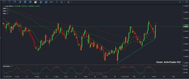 Theresa May è volata a Strasburgo per cercare di mettere le basi per la modifica del precedente accordo sui confini Irlandesi. La sterlina ne ha immediatamente beneficiato e dai minimi di 1,2960 ha guadagnato quasi 330 pips dai minimi in poco meno di 14 ore. Ora si trova in area 1,3210 e tecnicamente sembra aver violato le resistenze chiave e, nel caso di tenuta dei primi supporti, posizionati in area 1,3120 40, potrebbe accelerare verso 1,3350, precedente massimo e anche decisamente più in alto, nel caso di violazione di quest’area. I livelli successivi più significativi sono infatti posizionati in area 1,3660.