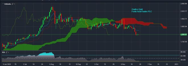 L’aspetto tecnico mostra come i prezzi si trovino in una situazione di eccesso di vendite, indicato anche dalla situazione di ipervenduto visibile sull’oscillatore RSI. Questo farebbe pensare che sul livello di supporto a 1.800 dollari l’oro potrebbe effettuare un rimbalzo di breve periodo che si sviluppa tuttavia all’interno di una tendenza ribassista di più lungo periodo.