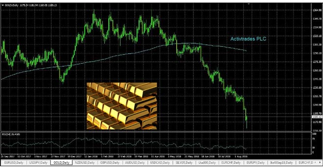 Oro in forte ribasso nei mercati internazionali con contratto di agosto (CFD ActivTrades Gold18, Daily) che amplia velocemente le perdite a seguito della rottura del livello di $1.200, dopo che gli osservatori di mercato riportano un miglioramento delle tensioni commerciali tra Cina e Usa.