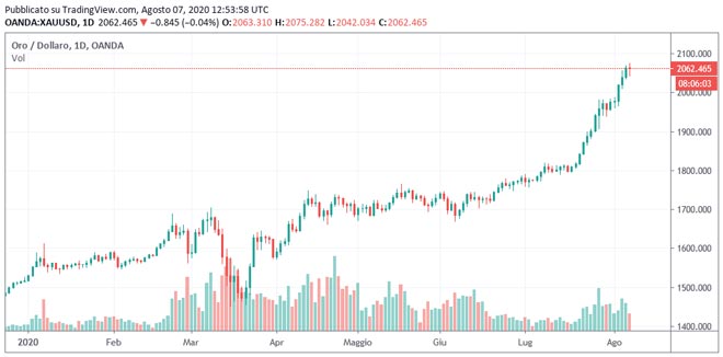 Il prezzo dell'oro è salito di oltre 100 dollari nell'ultima settimana, raggiungendo il nuovo massimo storico 2.077 dollari l'oncia. Per le statistiche, è la nona settimana consecutivi in guadagno per l'oro.
