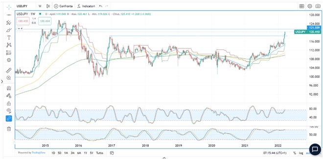 Sui cambi la reazione si è vista sul UsdJpy che è salito per la prima volta da anni cioè dal febbraio 2016, sopra quota 120.00, arrivando a 120.40 con la possibilità, se si osservano i grafici, di salire sui massimi registrati nel gennaio 2016 a 121.60. Se poi immaginiamo che da qui in avanti, il delta tasso, per effetto delle differenti prospettive legate alla politica monetaria, portate avanti da Fed e Boj, potrà solo aumentare, ci rendiamo conto come il trend in atto possa essere ancora ben lontano dall’essersi esaurito con target che non possiamo neppure escludere in area 125.80.