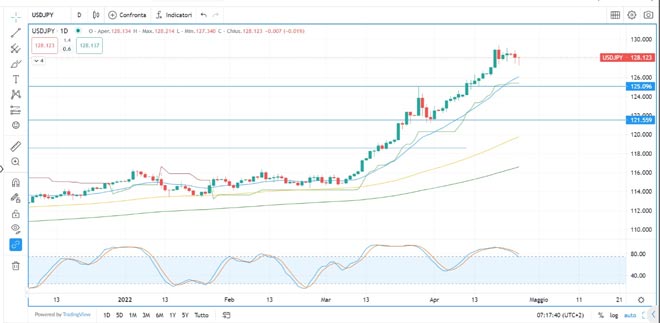 Sul fronte europeo, il Governo tedesco ha rivisto al rialzo le stime sull’inflazione, mentre dalla Bce, per ora, nessun segnale di allarme per il livello della moneta unica, che intanto, ieri, ha toccato dei minimi appena sotto quota 1.0700, in una discesa costante e progressiva, che a breve dovrebbe cominciare a preoccupare qualcuno a Francoforte. Anche il Cable ha proseguito nel suo declino, nonostante il mercato prezzi ancora un rialzo del costo del denaro di 150 basis points da qui all’autunno prossimo. Sterlina che si è stabilizzata leggermente contro euro, rimanendo tra 0.8400 a 0.8445. UsdCad che ha corretto 70 80 pips dopo le parole di Macklem che ha previsto più di un rialzo del costo del denaro, sulla falsariga di quanto la Fed va promettendo. Sullo Jpy segnaliamo, dopo tanta discesa, un ritorno del risk off e della valuta giapponese come asset rifugio, considerato il fatto che UsdJpy ieri ha cominciato a ripiegare sotto quota 128 (anche se stanotte ha tenuto i supporti tornandovi sopra), trascinando con se tutti i cross dello Jpy, specie contro Euro, con EurJpy tornato temporenamente sotto quota 137.00. Man mano che gli altri paesi alzeranno i tassi, mentre la Boj resterà accomodante, lo Jpy tornerà a rappresentare un asset rifugio, da acquistare nei momenti di paura degli investitori. E qualcosa, in tal senso, si intravede.