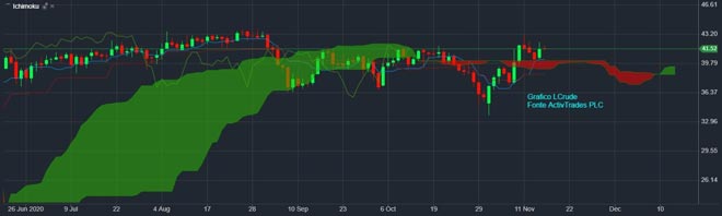 Il prezzo del petrolio (contratto LCrudeJan21, ActivTrades Daily) rimane molto volatile e segnala una grande incertezza degli operatori, fotografata anche dalla scarsa direzionalità del prezzo.