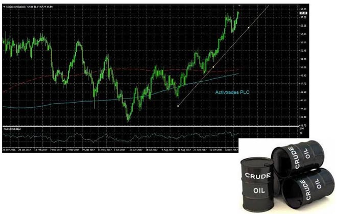 L'aspetto tecnico del contratto CFD ActivTrades LCrudeJan18 è quantomeno interessante perché fotograferebbe una possibile continuazione della fase rialzista, iniziata ancora lo scorso mese di giugno. Se aperte, si potrebbero ancora considerare posizioni in linea con il trend apparentemente rialzista con i prezzi di chiusura di giornata sopra $57.50 al barile con target che potrebbero arrivare in area $59 prima e possibili allunghi verso l'area dei $60.