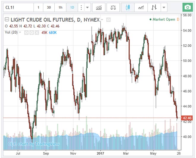 Dopo sei sessioni negative sulle ultime sette, il Petrolio capitombola anche ieri e stamattina. Oggi, il greggio era scambiato poco sopra i $42: solo ieri aveva toccato i minimi da inizio 2017.