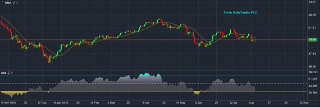 Fase molto interlocutoria per il contratto LCrudeSep19 (Petrolio Daily ActivTrades) che rimane intorno al valore di $55 per barile. Nella seduta odierna, i prezzi del petrolio risultano molto volatili mentre gli operatori che scommettevano sui prezzi in calo hanno riacquistato contratti per bloccare i profitti dopo il calo delle ultime sessioni a causa delle crescenti tensioni commerciali tra Cina e Stati Uniti.