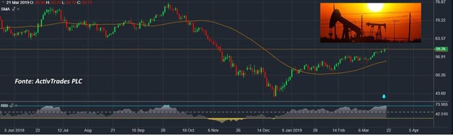 Graficamente si vede sulla piattaforma ActivTrader, come le quotazioni rimangano ancora sopra la media mobile a 50 periodi su time frame daily, ma la situazione di forte ipercomprato oltre alla resistenza in area $60 suggerisce una possibile pausa nel rialzo del prezzo.