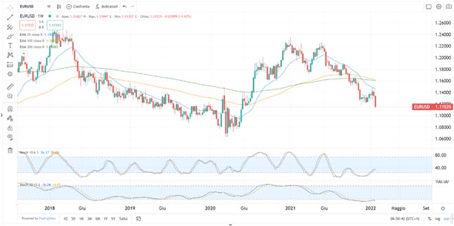 Questo dato, per il momento, conferma le previsioni di rialzo dei tassi da parte della Fed, e sul mercato abbiamo assistito al movimento di rialzo del dollaro che ha spinto e schiacciato al ribasso, senza soluzione di continuità, le principali valute concorrenti. Se osserviamo il dollar index da un punto di vista tecnico, scopriamo che il trend di rialzo ha preso vigore e sembra accelerare con obiettivi minimi in area 98.00 che se violato, sarebbe un buon viatico per il test dell’area psicologica di 100 che non si vede dal maggio 2020. Le ragioni di questo rialzo sono ovviamente da ricercare nelle aspettative legate ai tassi di interesse che al di fuori degli Usa, non sembrano avere le medesime probabilità.