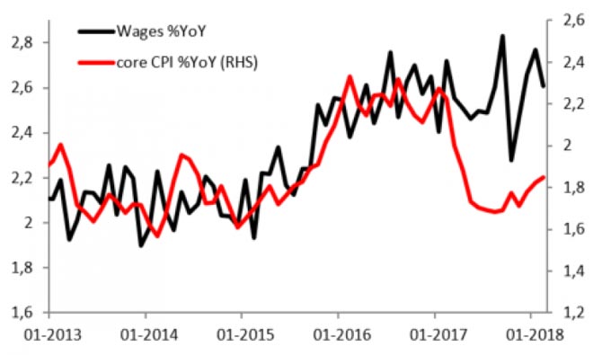 Il consenso è del 2,7% e dovrebbe essere raggiunto facilmente. L'effetto base è migliorato di quasi 0,2 punti percentuali, il che implicherebbe una lettura del 2,7-2,8%. L'effetto base continuerà a migliorare leggermente durante l'estate, quindi se vediamo un piccolo aumento delle pressioni salariali, una lettura del 3% è molto possibile nel secondo trimestre. Il rapporto sta per essere pubblicato venerdì, 13:30 GMT.