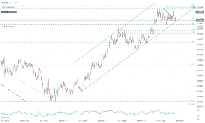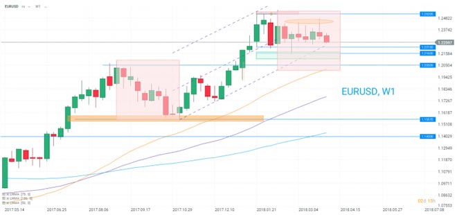 L'EUR/USD è in trend rialzista sugli intervalli D1 / W1, indipendentemente dal time frame. La domanda è però – questa tendenza potrebbe essere sostenuta? Sul grafico W1 possiamo vedere una zona di consolidamento significativa tra 1,21 e 1,25 e mentre questa potrebbe essere solo una pausa in una tendenza, si noti che le candele settimanali hanno per lo più picchi superiori. Ciò significa che gli impulsi verso l'alto della settimana sono stati rapidamente neutralizzati dai sellers – non esattamente un segno di forza.