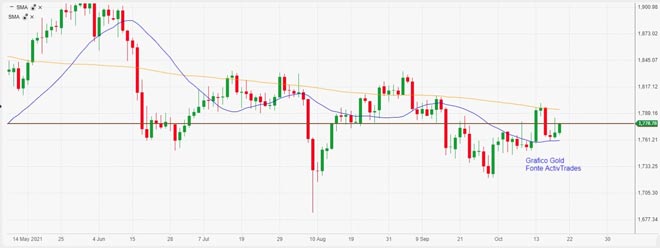 Nelle ultime sedute i prezzi dell'oro non riescono a trovare la forza per uscire dal trading range definito dalla resistenza a 1.800 dollari e dal supporto posto a quota 1.750 dollari. La situazione grafica vede i prezzi schiacciati tra la media mobile a 200 periodi, che frena ogni tentativo di risalita delle quotazioni, e la media più breve a 21 periodi.