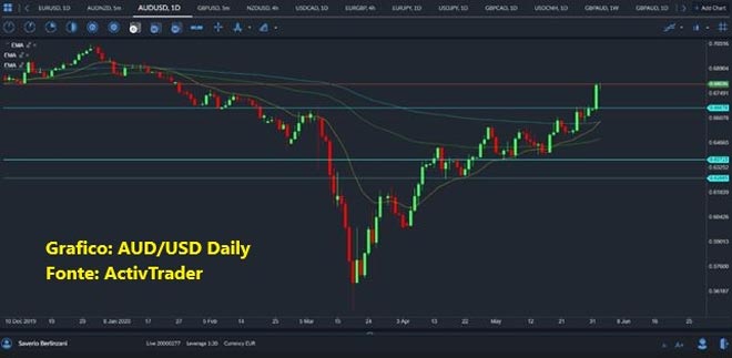 La Rba, Reserve Bank of Australia, ha lasciato i tassi invariati allo 0.25% questa notte e ha poi pubblicato lo statement ove si legge che la Banca Centrale è pronta eventualmente ad incrementare gli acquisti di obbligazioni se sarà necessario. I tassi, inoltre, non saliranno fino a quando non saranno confermati progressi verso la piena occupazione e i target di inflazione e la politica resterà accomodante per tutto il tempo necessario. Nel commento si legge che l’economia sta attraversando una recessione importante, in cui la spesa delle famiglie si è indebolita anche se l’entità della recessione potrebbe essere inferiore di quanto previsto in precedenza. I mercati finanziari restano solidi. Gli effetti sulla valuta sono stati quasi insignificanti anche se segnaliamo il fatto che rispetto alle precedenti riunioni, in cui si era parlato della necessità di mantenere un tasso di cambio debole, in questa occasione non si legge nulla al riguardo. AudUsd sembrerebbe essere indirizzato verso 0.7030 da dove tutto è partito a inizio dell’anno, anche se le condizioni di ipercomprato e qualche eccesso di breve termine potrebbero rallentarne la salita. A giocare invece a favore di una ulteriore accelerazione, vi sono le posizioni del mercato che sta comprando dollari Usa già da un po’ contro Aud e si trova scoperto e short di Aud contro tutte le valute, e spesso questo è un buon segnale per una continuazione (almeno fino ad eccessi rilevanti, attraverso quello che noi chiamiamo lo spoof finale prima di una inversione ovvero un movimento rapido e significativo che va a prendere gli stop i chi non può reggere la posizione short a causa della leva).