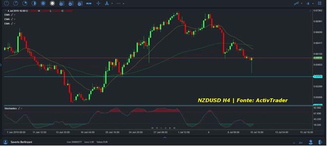 Sul fronte mercato e prezzi, segnaliamo la debolezza rinnovata di AUD, in ragione del dato inferiore alle attese della fiducia dei consumatori, uscita a -4.1%, a 96.50 nel mese di luglio rispetto ad un dato precedente di 100.7, il minimo degli ultimi 2 anni. In compenso l’inflazione in Cina è uscita a + 2.7% come da attese. Il dollaro australiano è sceso vicino a 0.6900 e resta leggermente sotto pressione anche se sul daily cominciano ad intravedersi divergenze inverse che potrebbero generare una qualche ripartenza nel medio termine, in una lenta fase di accumulazione a possibili minimi crescenti. NZDUSD è sceso fino a 0.6575 stanotte in un movimento repentino causato molto probabilmente dalla presenza di qualche stop-loss al di sotto di 0.6600 e anche dal dato sui prezzi delle abitazioni, cresciuto meno delle attese a + 1.7% rispetto al +3.2% atteso. Tecnicamente si è formato un hammer sul 4 ore che lascia intendere un possibile rialzo di breve termine. Tra le altre valute segnaliamo il Cable, ancora sotto pressione e vicino al supporto chiave di 1.2430, minimo visto il 3 gennaio sul flash-crash avvenuto di notte, con la possibilità anche di rompere tale livello in assenza di grandi novità sulla Brexit, che sembra sempre di più andare verso una soluzione di rottura con la Ue, e senza quindi un accordo di uscita. EURGBP vicino alle resistenze chiave in area 0.9000 20, tutta un’area dove potremmo assistere a correzione. Infine, un’occhiata a AUDCAD e NZDCAD che restano sotto pressione anche se sono in formazione divergenze e possibili correzioni anche significative, dai livelli attuali. Molto dipenderà da USDCAD che sembra per il momento tenere l’area di 1.3100.