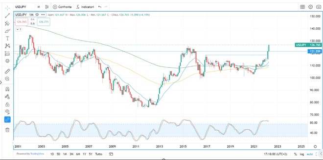 Tornando agli azionari segnaliamo che il Nasdaq ad aprile, ha perso il 13%, la massima discesa dal 2008, mentre l’S&P 500 ha ceduto quasi il 9% nello stesso periodo. Il Dow invece ha lasciato sul terreno il 4%. Sui cambi, il dollaro, se osserviamo il dollar index, ha guadagnato nel mese di marzo quasi il 5%, con tutte le valute concorrenti che hanno sofferto la forza della divisa americana. L’Eur ha perso il 5%, lo Jpy il 7.5%, la sterlina il 5.5%, il dollaro canadese il 2.5% e Aud e Nzd rispettivamente il 6.5% e l’8%. Si tratta di percentuali impressionanti perché parliamo di valute e non di azioni e assomigliano molto, come price action e movimenti percentuali, a quanto avevamo visto durante il mese di marzo 2020, al culmine dell’esplosione della pandemia. Da allora, tante cose sono cambiate e oggi, possiamo dirlo, anche in peggio, con una guerra che sembra non avere fine, specie per lo stallo della diplomazia, che non riesce a creare le condizioni per un cessate il fuoco. La situazione macro è assai complessa e diventa difficile non ipotizzare il ritorno della recessione nei mesi a venire, in alcune aree, specie se non si troveranno le condizioni per sbloccare le strozzature dell’offerta e soprattutto le sanzioni alla Russia, in dipendenza di una eventuale fine della guerra, ovviamente.