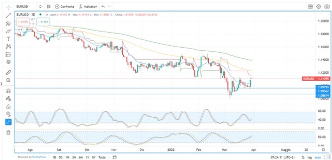 Tra le altre valute segnaliamo la discesa di UsdJpy in seguito alle dichiarazioni dei rappresentanti della Boj, i quali si sono detti contrari a lasciar svalutare artificialmente la valuta. Minimi visti a 121.98 e chiusura nuovamente sopra 122.80 anche se comunque sotto l’apertura che era stata a 124.15. UsdCad stabile in area 1.2500 e oceaniche che hanno recuperato dopo aver perso ieri qualche decina di pips. Supporti a 0.7460 e 0.6875 rispettivamente per Aud e Nzd. Da un punto di vista della strategia, in questa fase, a noi piace pensare che una eventuale risoluzione del conflitto darebbe la spinta per un ribasso del dollar index e del dollaro in generale, con la moneta unica che, non si può escludere, potrebbe anche tornare in area 1.1500.