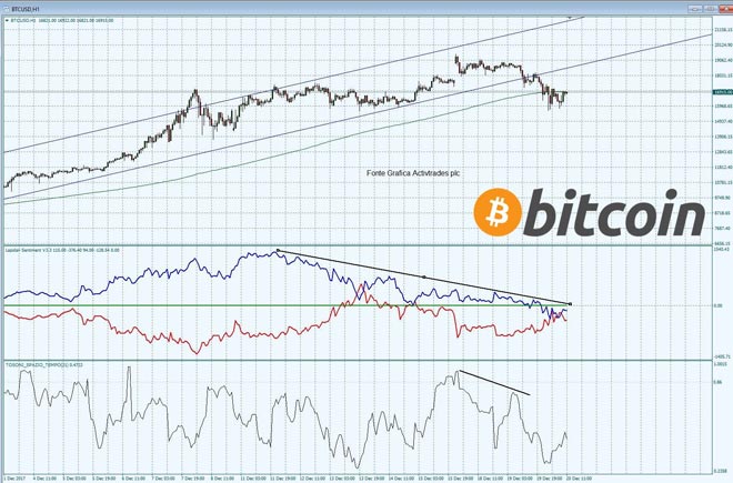 Stanotte in Asia ha tenuto banco il ribasso del Bitcoin, che è arrivato a perdere oltre 2500 $ (circa il 15%) per poi rimbalzare nell’ultima ora. La buona notizia, personalmente parlando, è che il grafico – e gli indicatori ad esso legati – è molto lineare sia utilizzando le consuete tecniche di analisi grafica sia osservando il comportamento degli indicatori.