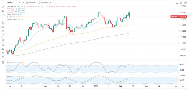 Questa settimana, per contro, abbiamo notato queste due forze contrapporsi, in mezzo a nuove dichiarazioni e dati che non hanno fatto altro che alimentare tale contrasto. Le conseguenze sono stati movimenti erratici, volatili e caratterizzati da inversioni repentine, specie dopo i dati sull’inflazione di giovedì negli Usa, superiori alle attese, e le parole di Bullard che hanno di fatto confermato che la Fed alzerà i tassi di 50 basis points, a meno di improbabili stravolgimenti nei dati. Non solo, ma le previsioni ormai danno per scontato un rialzo di 100 basis points nei prossimi 4 5 mesi. Come se non bastasse, venerdì in chiusura della sessione americana, sono giunte notizie allarmanti dal fronte orientale, dove Russia e Ucraina, secondo fonti del Dipartimento di Stato americano, starebbero per entrate in conflitto con la prima pronta ad invadere la seconda. Escalation della tensione quindi, che ha provocato un piccolo terremoto sui mercato e una improvvisa caduta del UsdJpy sui cambi, con la contemporanea salita di tutti gli altri dollari, in perfetta correlazione atipica, risk off.
