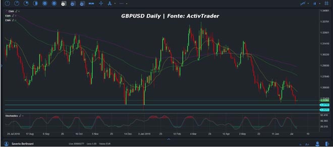Venendo ai tassi di cambio, segnaliamo la debolezza dell’Euro su dollaro con il Cable che segue a ruota, e non accenna a rimbalzare. La questione Brexit resta prioritaria e un no deal Brexit sembra probabile per il prossimo autunno. La valuta resta sotto pressione e per il momento, nonostante la presenza di divergenze e segnali di possibile inversione, senza una adeguata inversione anche politica, dubitiamo che possano esserci movimenti contrari, se non mere correzioni. Ciò vale anche per tutti i cross della sterlina, in particolar modo per GbpCad che dal 6 maggio, ovvero in un paio di mesi, è scesa di 1.500 pips circa pari a quasi il 9%. Sono scese anche le oceaniche, in ragione sia del taglio del costo del denaro in Australia, sia perché la questione dazi deve ancora essere risolta. Bisogna però dire che sembra che le aree comprese tra 0.6940 e 50 per Aud e 0.6590 e 0.6600 per Nzd, possano tenere gli ulteriori tentativi di ribasso. UsdCad sempre debole con i livelli di 1.2970 80 come obiettivi, sempre a tiro.