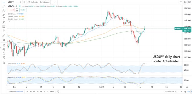 Sul fronte dati questa mattina usciranno quelli sull’occupazione inglese, a cui seguiranno lo Zew tedesco alle 11.00, l’indice relativo allo stato di salute del settore industriale tedesco, mentre nel pomeriggio usciranno i dati sui flussi di capitali netti da e verso gli Usa, i Tics, ovvero i Treasury International capital system, attesi intorno ai 140 miliardi di dollari nel solo mese di novembre. Il dollaro sembra tenere egregiamente i supporti e pare voler ricominciare ad attaccare le resistenze, come si evince da quel 94.45 di Dollar index che per ora è parso un muro invalicabile. Anche l’EurUsd e il Cable continuano a cozzare sulle resistenze intorno a 1.1440-50 il primo e 1.3690-1.37 il secondo senza riuscire a sfondare. Il Petrolio, ed è questa la notizia, tenta lo sfondamento dei livelli di 85 dollari al barile (il crude), prezzo che spinge al rialzo anche il Cad contro tutte le principali valute, con il CadJpy ritornato quasi a quota 92.00. Il Gold non riesce a sfondare quota 1830, almeno per il momento, ma la partita è ancora tutta aperta, anche se la salita dei rendimenti dei treasuries potrebbe tenerlo sotto pressione. Noi riteniamo che quest’anno vi siano le condizioni, per un aumento dell’avversione al rischio, anche se per ora rimane un qualcosa di latente e sommerso. Per questo osserviamo con attenzione lo yen, che resta un ottimo indicatore per percepire la paura sui mercati. Ma occorre fare molta attenzione anche ai dati macro che usciranno nei prossimi due mesi.