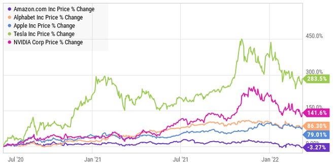 Come puoi vedere sopra, le azioni Amazon sono rimaste molto indietro rispetto al mercato e a molti dei suoi omologhi tecnologici a grande capitalizzazione negli ultimi 20 mesi circa. Alphabet, Apple, Tesla e Nvidia hanno diviso le proprie azioni a un certo punto negli ultimi 20 mesi, con Apple e Tesla che si sono ‘separate' nell'agosto 2020, Nvidia si è divisa nel luglio 2021 e Alphabet ha annunciato di recente la sua divisione, che non ha ancora preso effetto.