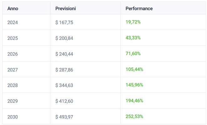 Sulla base della crescita media annua delle azioni Alphabet. negli ultimi 10 anni, la previsione per l’inizio del prossimo anno è di 167,75 dollari. Utilizzando le stesse basi, ecco la previsione sulle azioni Alphabet Inc. per ogni anno fino al 2030.