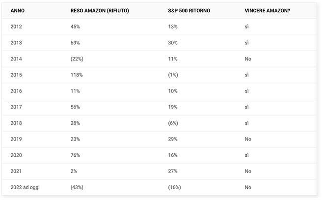 Innanzitutto, vediamo come si è comportata Amazon contro il mercato negli ultimi dieci anni.