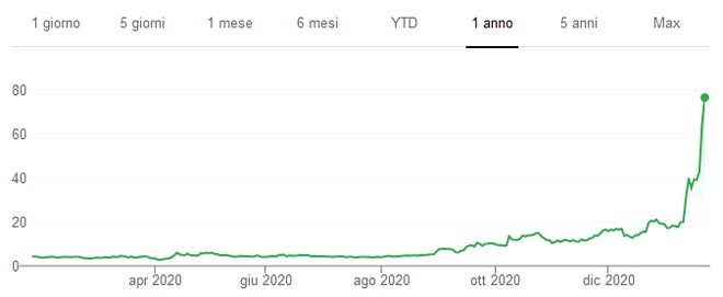 Le azioni GameStop (NYSE: GME) sono salite alle stelle nelle ultime settimane con un balzo di oltre il 400% dall'inizio del 2021. Le azioni nella giornata di ieri sono salite a circa 150 dollari prima che le contrattazioni fossero interrotte a causa della estrema volatilità. La giornata di contrattazioni è poi terminata con il prezzo delle azioni GameStop a 76,79 dollari.