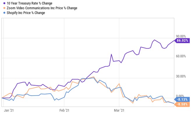 Ecco cosa è successo a Zoom Video Communications (NASDAQ: ZM) e Shopify (NYSE: SHOP), che hanno entrambi generato una crescita robusta durante la pandemia, poiché il rendimento dei Titoli del Tesoro è aumentato quest'anno.