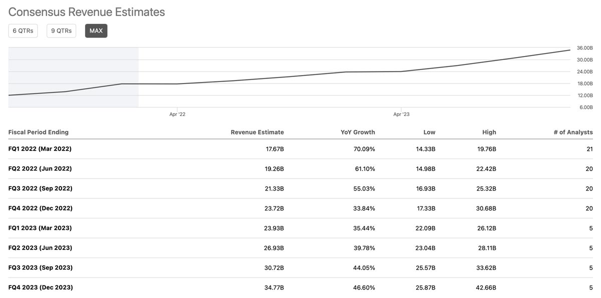 Vediamo che la storia di crescita di Tesla rimane ben intatta poiché la società dovrebbe procedere ad espandere sostanzialmente i ricavi e l’EPS negli anni futuri.