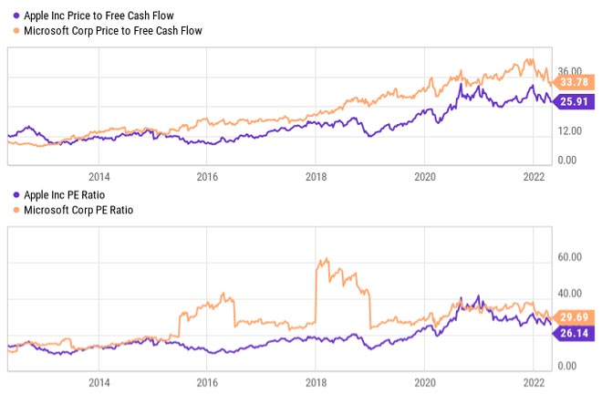 Inoltre, se confrontato con uno dei suoi principali concorrenti, Microsoft, Apple il titolo è scambiato con uno sconto basato su quelle stesse metriche.
