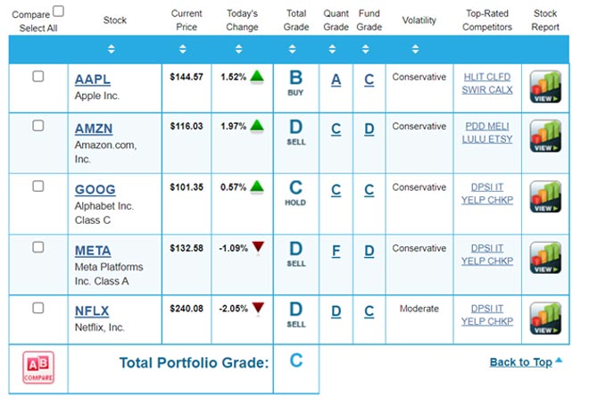 Come puoi vedere nel Report sopra, i voti totali sono misti. Apple ha una classificazione B, il che lo rende un “Compra“. Google ha un C-rating, che lo rende un “Hold“. E Amazon, Meta e Netflix hanno rating D, il che li rende “vende“.