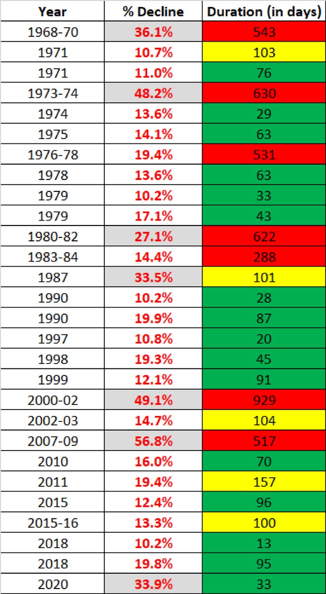 Per quanto riguarda quando è probabile che si verifichi la prossima correzione: tali eventi sono apparentemente casuali. Dai un'occhiata a questa tabella, che mostra ogni correzione, crollo e mercato ribassista dell'S&P 500 durante il periodo di 50 anni dal 1970 al 2020, insieme al calo percentuale dal massimo al minimo del mercato e quanto tempo è durato ciascuno dal picco al trogolo. Vedi se riesci a individuare una tendenza di mercato: