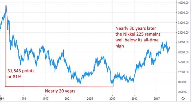 Sebbene il mercato sia diminuito in termini percentuali rispetto al 1929, è stata la più grande quantità di ricchezza spazzata via nella storia del NYSE. Un altro crollo importante nella storia del mercato ribassista si è verificato sull'indice giapponese Nikkei 225, che è sceso da 38.900 nel 1989 a 7.055 nel 2009. Quasi 30 anni dopo il picco, l'indice Nikkei è ancora più del 38% al di sotto del massimo storico.