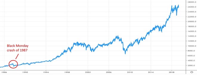Il crollo del mercato azionario del 1987, avvenuto il 19 ottobre 1987, il Black Monday, fu un crollo più grave. Tuttavia, il mercato si è ripreso entro 2 anni. All'epoca il crollo del 1987 fu un grosso problema con le azioni che perdevano fino al 32% in 3 giorni. Ma se guardi un grafico a lungo termine dell'indice Dow Jones, quel crollo sembra una piccola correzione.