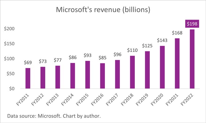 Nell'anno fiscale 2022 di Microsoft (terminato il 30 giugno), le entrate di Azure sono cresciute di circa il 45% (sulla base di una media calcolata dei rapporti di crescita trimestrali riportati perché Microsoft non rilascia le entrate effettive di Azure) mentre il resto della sua attività è cresciuto di appena il 18 %.
