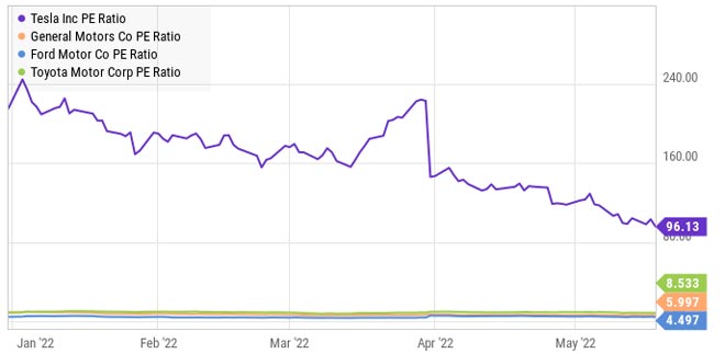 Al valore nominale, la valutazione delle azioni Tesla sembra sproporzionata. Il titolo è scambiato a 95,8 volte gli utili oggi, indicando una valutazione elevata in sé e per sé. Il confronto tra il rapporto prezzo/utili del colosso dei veicoli elettrici e quello di altre case automobilistiche dipinge un quadro ancora più chiaro.