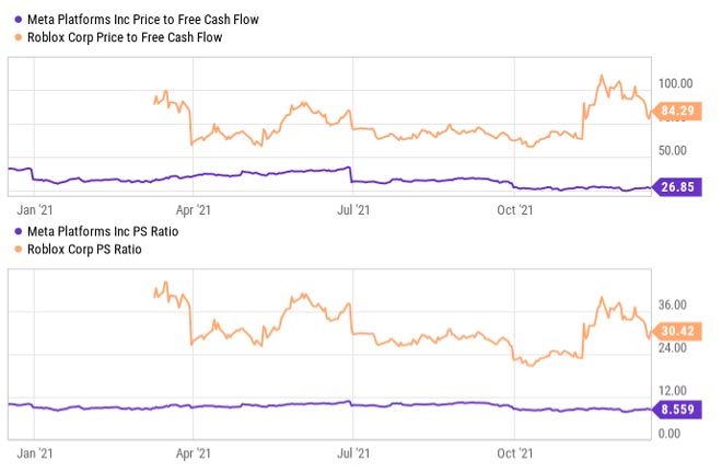 Guardando il rapporto prezzo/vendite e il rapporto prezzo/flusso di cassa libero per ciascuna società, è chiaro che Roblox sia quotato molto al di sopra di Meta (vedi grafico). In entrambe le metriche, Roblox è circa tre volte più costoso. A mio parere, è un premio troppo alto da pagare per Roblox, anche se sta aumentando le entrate e il denaro dalle operazioni a tassi più veloci rispetto a Meta.