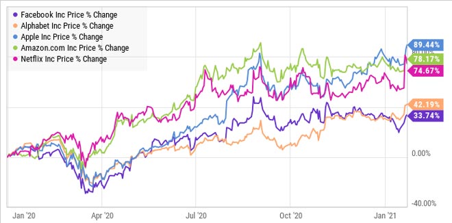 Facebook (NASDAQ: FB) e la holding a cui fanno capo Google Alphabet (NASDAQ: GOOGL) (NASDAQ: GOOG) sono stati i due titoli FAANG con le peggiori prestazioni nel 2020, molto indietro rispetto ad Apple (NASDAQ: AAPL), Amazon (NASDAQ: AMZN) e Netflix (NASDAQ: NFLX) durante l'inizio della pandemia COVID-19.
